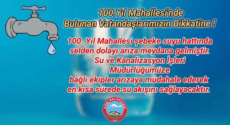 Ağrı Belediyesi tarafından sosyal medya hesapları üzerinden yapılan duyuruda merkeze bağlı 100. yıl mahallesi su şebekesinin sel nedeni ile zarar gördüğünü açıkladı.