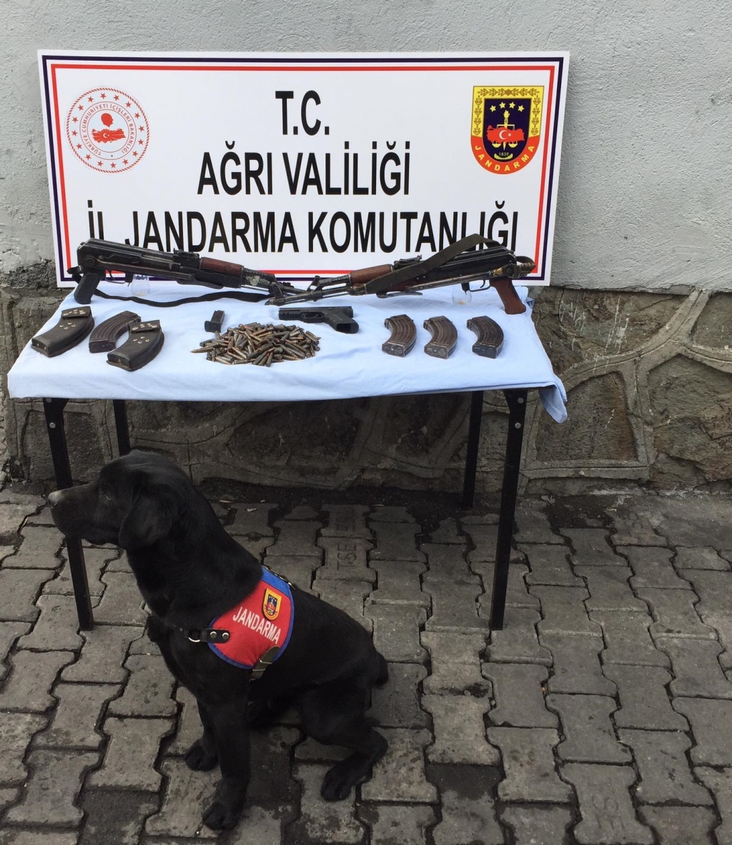 "Ağrı ili Hamur ilçesinde şüpheli 2 şahsın evlerinde 22 Şubat tarihinde mayın ve bomba arama köpeklerinin de katılımıyla yapılan aramada, 2 adet kaleşnikof piyade tüfeği, kaleşnikof tüfeğine ait 4 adet şarjör, 148 adet 7,62 mm. çapında fişek ve bir adet kurusıkı tabanca geçirilmiştir.