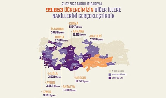 Kahramanmaraş merkezli meydana gelen iki büyük deprem 10 ilde büyük yıkıma yol açtı. Bakan Özer, sosyal medya hesabından şu ifadeleri kullandı:"10 ilimizdeki öğrencilerimizin diğer illere nakilleri kapsamında 99 bin 853 öğrencimizin nakil işlemini gerçekleştirdik. Evlatlarımız, geleceğimizdir. Her imkân ve koşulda yanlarında olmaya devam edeceğiz." (İLKHA) 10 ilimizdeki öğrencilerimizin diğer illere nakilleri kapsamında 99 bin 853 öğrencimizin nakil işlemini gerçekleştirdik.