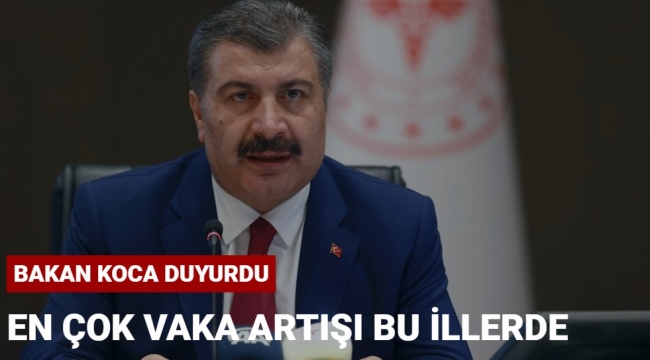 EN ÇOK VAKA ARTIŞI OLAN İLLERSağlık Bakanı Fahrettin Koca, Twitter'dan yaptığı açıklamada son bir haftada hasta sayısı en çok artan illeri duyurdu.Koca "Son hafta günlük hasta sayısı en çok artan illerimiz; Van, Karaman, Erzincan, Çankırı ve Kayseri. Ağır hasta sayısı en çok olan illerimiz; İstanbul, Ankara, Konya, Erzurum ve Yozgat. Tedbirlere birlikte uyarak başarılı olabiliriz. Birlikte tedbirli olalım" ifadelerini kullandı.