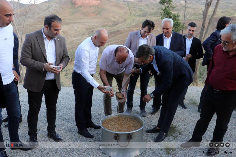 Ekinci, "Rivayet odur ki, aşurenin kökeni de Hz. Nuh Peygamberimize dayanmaktadır. Biz de Hz. Nuh'un Gemisi'nin siluetinin bulunduğu bu özel noktada hem ilçemizdeki turizmi geliştirmek hem de bölgede bir farkındalık oluşturmak için bir araya geldik. Çok güzel bir etkinlik olduğunu, yansımasının güzel olacağını düşünüyorum." dedi.Doğubayazıt Belediye Başkanı Yıldız Acar programda yaptığı konuşmasında, "Kıymetli misafirlerimiz bugünün İslam tarihi açısından hem Doğubayazıt bölgesi açısından çok kıymetli bir anlam taşıdığını belirtmek isterim. Bilindiği gibi Hz. Nuh Peygamberin Gemisinin Ağrı'da olduğuna dair bilimsel çalışma ve açıklamalar kapsamında çok araştırmalar yapıldı. Şuanda Nuh'un Gemisindeyiz ve aşure yiyoruz. Annemden duymuştum, Hz. Nuh'un Gemisi Ararat Tepesine indikten sonra artık yiyecekler son aşamasına gelmişti yiyilebilecek çok şey kalmamıştı. Dolayısıyla besin maddelerinden nohut, fasulye, incir, fındık, fıstıktan biraz alınarak tek başına pişirilmiş ve orada bulunan canlıların verilmiş. Aşure yemeği bu şekilde çıkmış." ifadelerini kullandı.Doğubayazıt Ticaret ve Sanayi Odası Başkanı Cemal Can ise, "Doğubayazıt bildiğimiz gibi sınır ticareti ve turizm dışında bir geliri yok. Biz alanı başarılı yapmamız lazım. Doğubayazıt Sanayi ve Ticaret Odası Başkanlığı'na geldiğimiz günden bu yana çeşitli etkinlikler yaptık ve yapmaya da devam edeceğiz. Doğubayazıt'ta yatırım yapan dostlarımıza da ayrıca teşekkür ederiz." şeklinde konuştu.Etkinlik sırasında bölgeye gelen Polonya ve Hong Konglu turistler, hem aşure yedi hem de Nuh'un Gemisi'nin kalıntıları olduğuna inanılan alanı gezdi. (İLKHA)