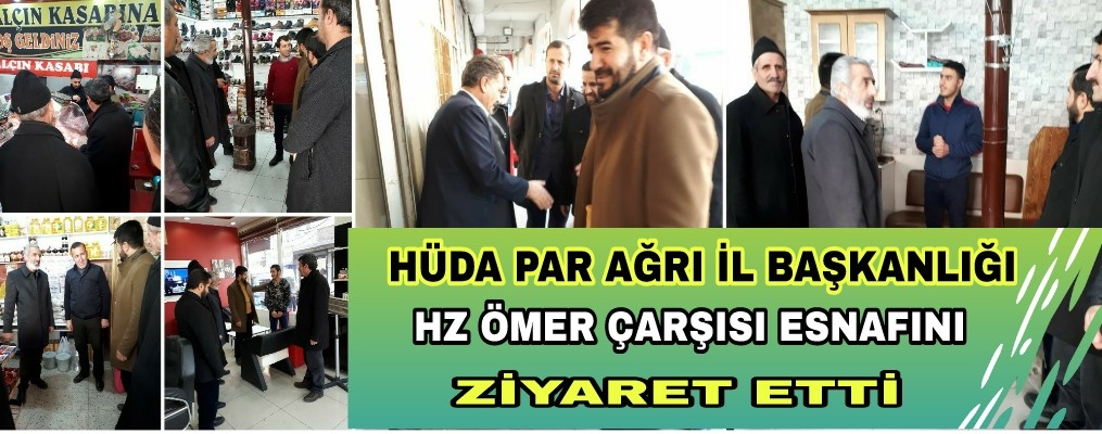 HÜDA PAR Ağrı İl Başkanlığından bir heyet il merkezinde Hz Ömer Caddesi esnafını ziyaret ederek sorun sıkıntılarını dinledi, taleplerine kulak verdi.Hz Ömer Çarşısı esnafının sıcak ilgisiyle karşılanan heyet, ziyaret sonrası esnafın sorun, sıkıntı ve taleplerinin yetkililer tarafından görmezlikten gelinmemesi gerektiğini belirterek yetkililere çağrıda bulundu.Çarşı esnafının sorunlarını basına değerlendiren HÜDA PAR Merkez İlçe Başkanı Rıfat Yılmaz, “HÜDA PAR İl Teşkilatı olarak esnafımıza yönelik ziyaretlerimiz aksamadan devam ediyor.Hz. Ömer Çarşısı esnafını ziyaret ederek sıkıntılarını dinledik, taleplerine kulak verdik. Esnaflarımız bazı sorunları bizimle paylaşarak Ağrı’ya Cumhurbaşkanı geldiği zaman geçeceği güzergahlar asfaltlanıyor diğer yollarımız perişan halde,Et ithalatı kasapları etkilediğini dile getiren esnaflar her gelen yetkili vaatlerini sıralayıp gidiyor yıllardır Hastane için talimat vermeyen yetkili kalmadı ama hastane açılmadı Esnafla ilgilenen bir kurumun olmadığından şikayet eden esnaflar bizim gibi küçük esnaf perişan durumdadır.diye sorunlarını dile getirdiler. Esnaf kardeşlerimiz, bu gibi sıkıntılarının bir an önce giderilmesini talep edilmektedirler.” ifadelerini kullandı.HÜDA PAR Ağrı İl Teşkilatı olarak, esnafın sıkıntılarını dile getirmeye devam edeceklerini belirten Yılmaz, “Buradan yetkililere sesleniyoruz! Esnafımız başta olmak üzere vatandaşlarımızın yaşadığı sıkıntıları ve mağduriyetlerini bir an önce giderin.” dedi.