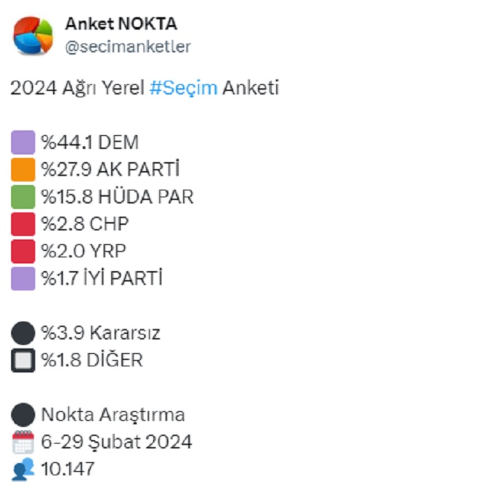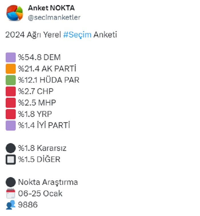 Nokta Anket Şirketinin Ağrı ile ilgili Mahalli İdareler Seçimleri anketinde önemli değişimler var.