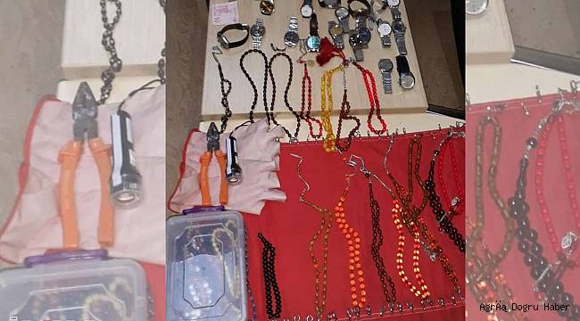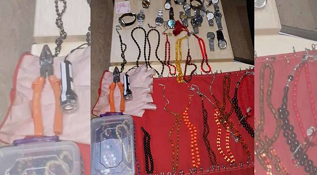 Dün gece saatlerinde girdiği işyeri içerisinde almış olduğu 35 civarı kehribar tespih, 20 civarında farklı markalarda antika kol saatleri, altın ve madeni paralar olmak üzere 14 bin TL civarında mal ile kaçan şüpheli bekçilerin kendisini fark etmesi üzerine kaçmaya başladı.