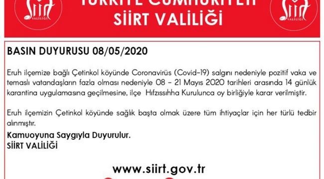 Valilikten yapılan açıklamada, "Eruh ilçemize bağlı Çetinkol köyünde koronavirüs salgını nedeniyle pozitif vaka ve temaslı vatandaşların fazla olması nedeniyle 8-21 Mayıs 2020 tarihleri arasında 14 günlük karantina uygulamasına geçilmesine, İlçe Hıfzıssıhha Kurulu'nca oy birliğiyle karar verilmiştir. Eruh ilçemizin Çetinkol köyünde sağlık başta olmak üzere tüm ihtiyaçlar için her türlü tedbir alınmıştır." denildi. (İLKHA)
