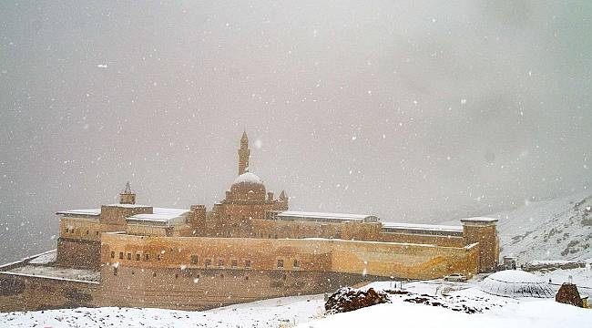 Her mevsim olduğu gibi kış mevsiminde de manzarası ile seyirlik görüntüler oluşturan İshak Paşa Sarayı, kar yağışı ile birlikte yavaş yavaş yaklaşan sislerin içinde kaybolması görüntülere yansıdı.