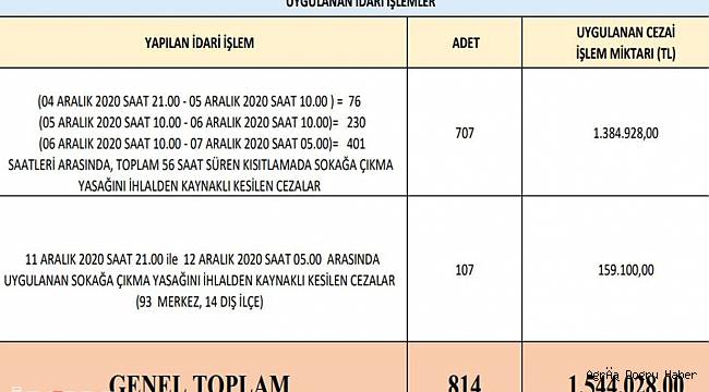 Sokağa çıkma kısıtlaması süresi içerisinde 14 ilçe ve 93 merkezde yapılan uygulamalar neticesinde 814 kişiye toplam bir milyon 544 bin 28 TL ceza kesilmiş oldu. (İLKHA)