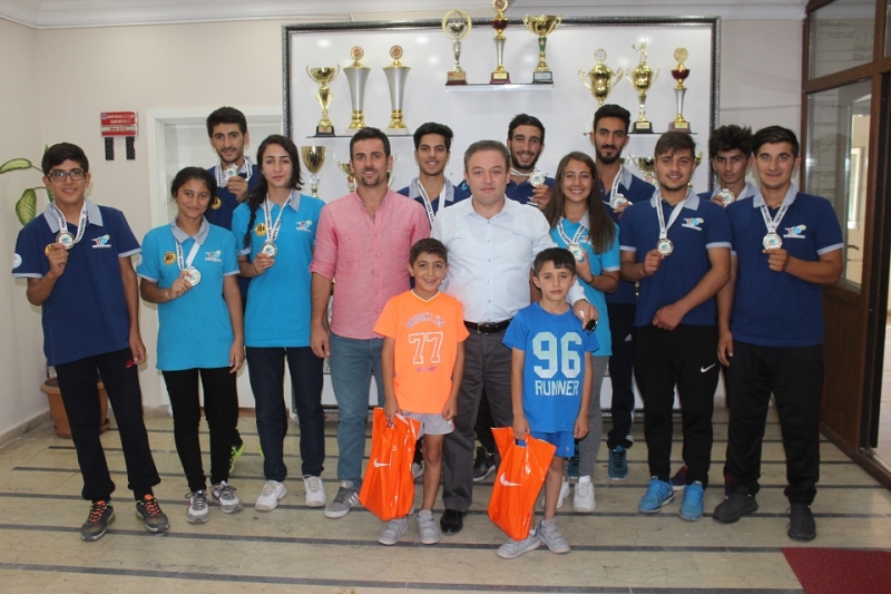 Doğu’nun şampiyonları ve antrenörleri Fırat Balkis ile birlikte kazandıkları şampiyonluk kupası ile İl Müdürü Aziz Sinan Alp’ı makamında ziyaret ederek mutluluklarını İl Müdürü Alp ile paylaştılar.